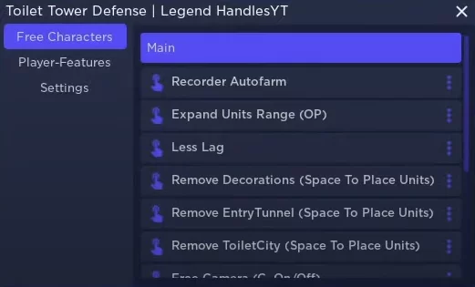 We publish for you a new cool script on Toilet Tower Defense from the famous author under the nickname Legend Handles. The script has quite a lot of functions simplifying the gameplay, such as Recorder Autofarm, Expand Units Range, Remove Objects, Player Features, and others. How to properly use the functions of this script you can see the author on the YouTube channel, who describes this script in detail.