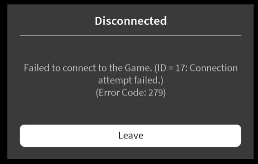 Error 279 in Roblox is one of the most common problems encountered by players on PCs, phones, and tablets. It manifests itself with a message like this: Failed to connect to the Game. (ID = 17: Connection attempt failed.) (Error Code: 279). This means that the Roblox client cannot establish a connection with the game server.